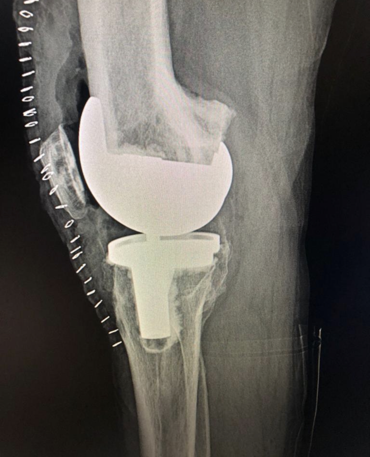 The options of navigated and robotic replacement were offered. Settled for a simpler local custom made distal cutting jig , followed by gap method for a Varus valgus stabilised knee